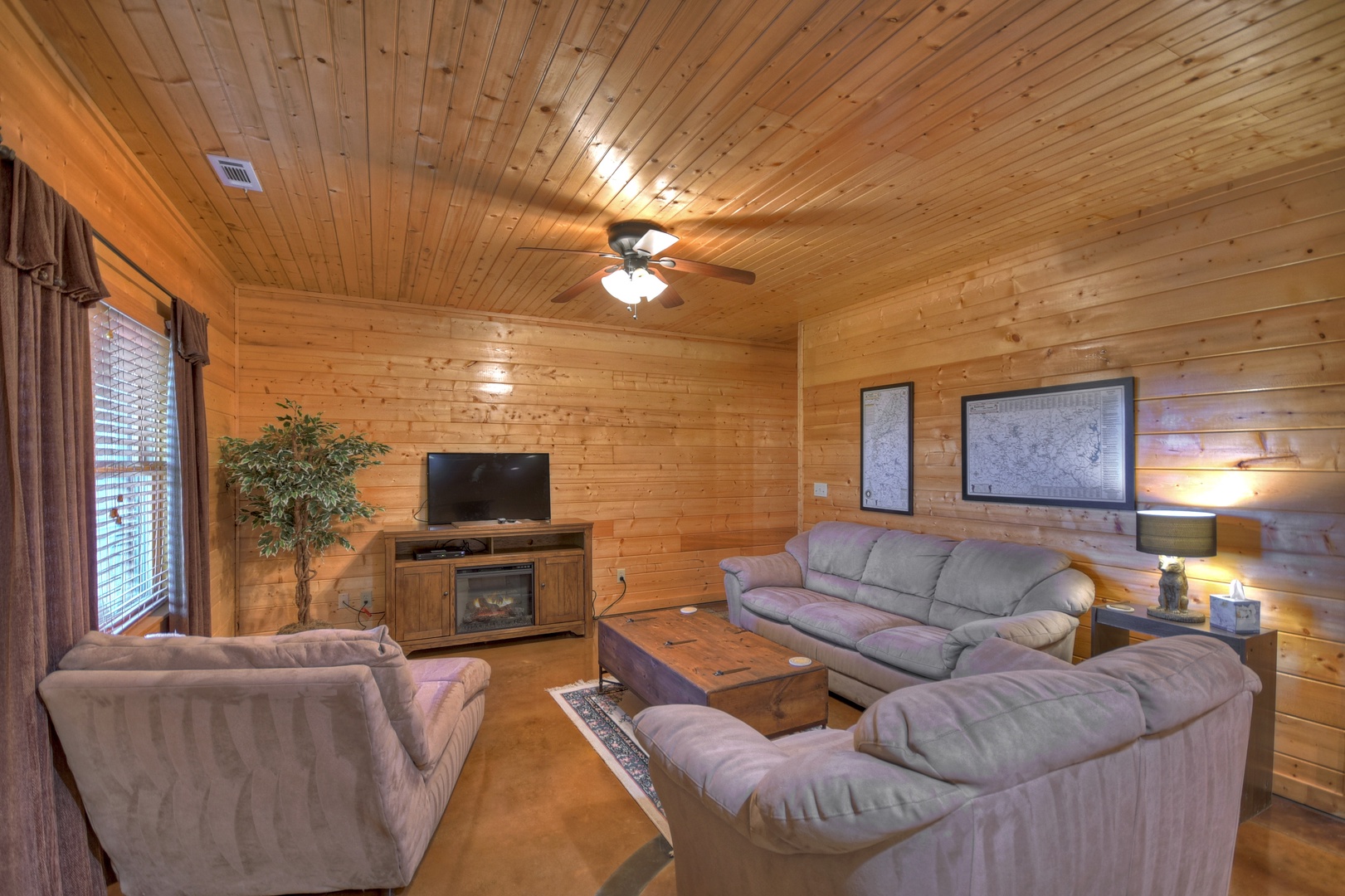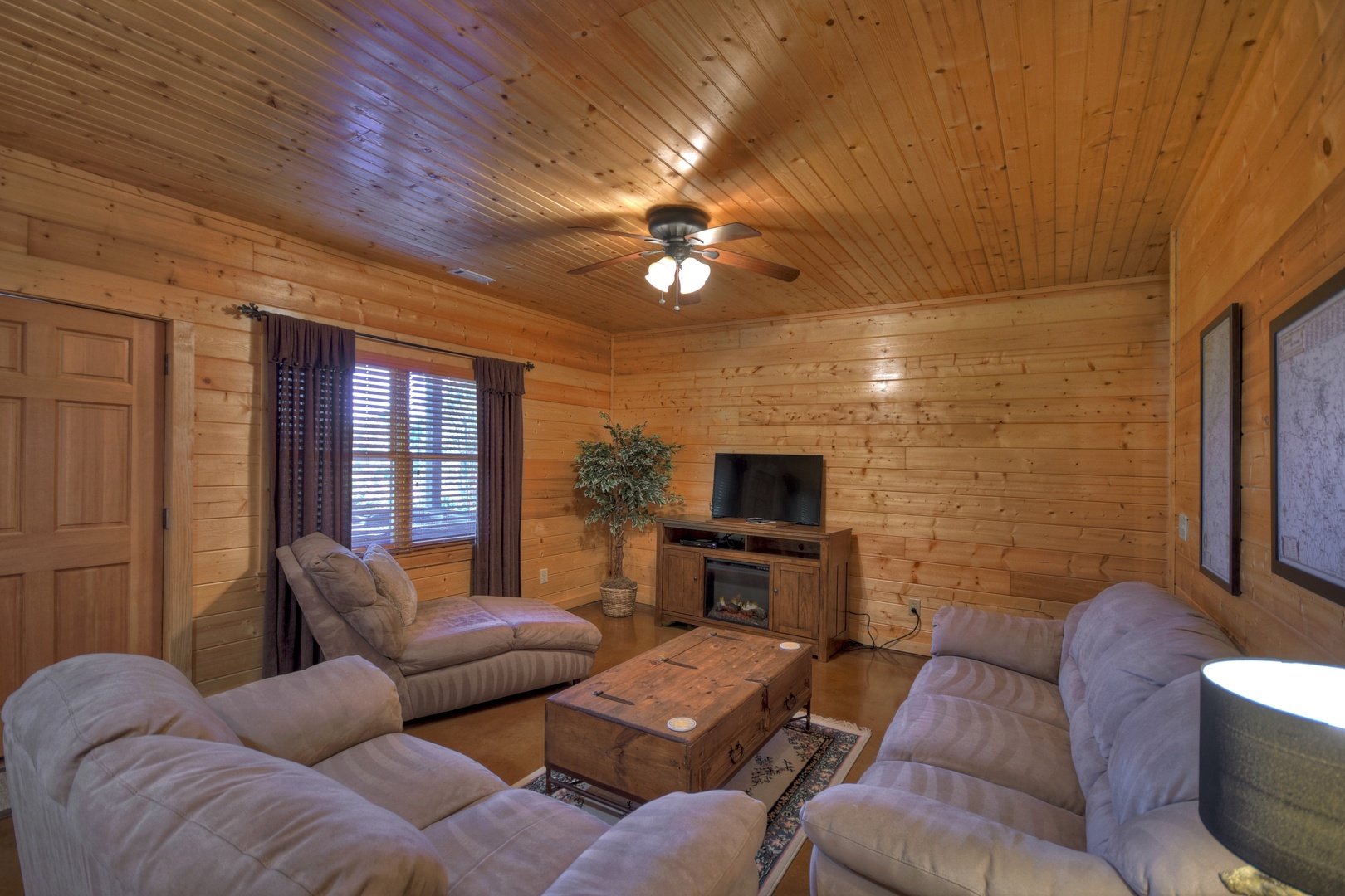 - Den area with lots of comfortable seating around a 50” smart TV over an electric fireplace