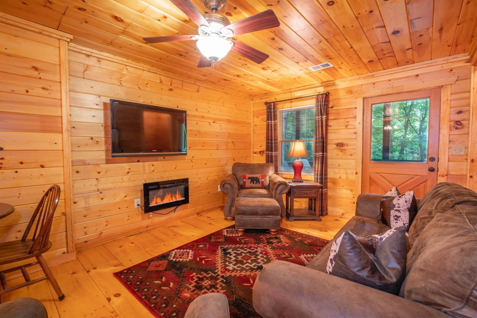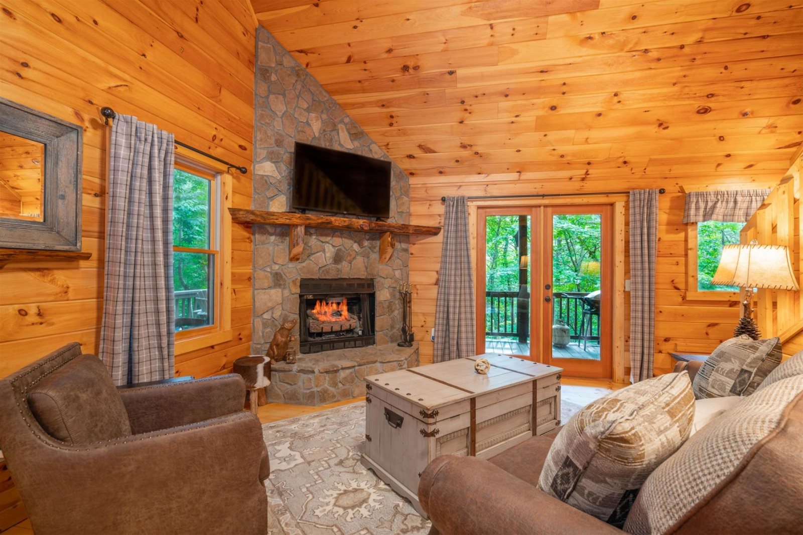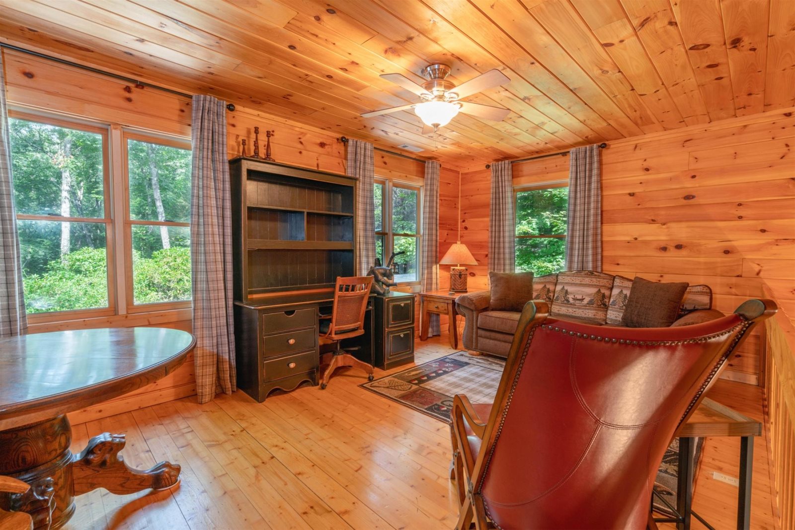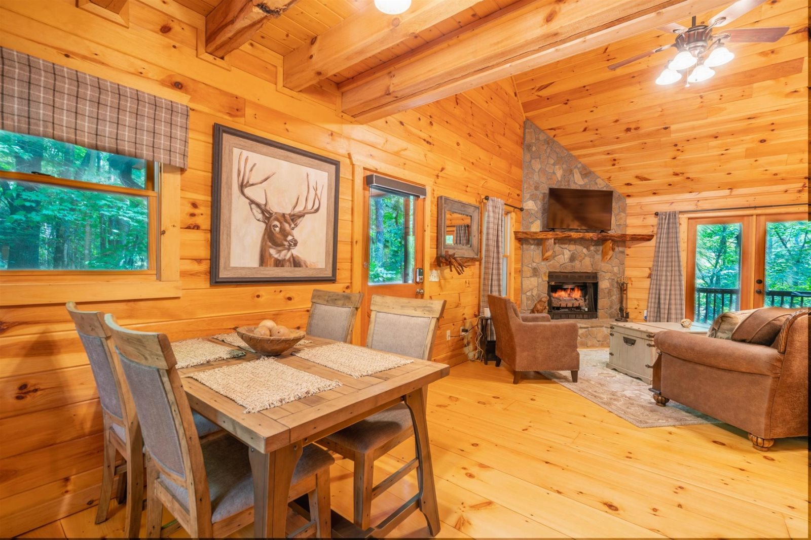 With a fully equipped kitchen, updated appliances, and a custom farmhouse-style dining room table, mealtime at Hibernation Station is easy to enjoy and always a treat at this wooded retreat.