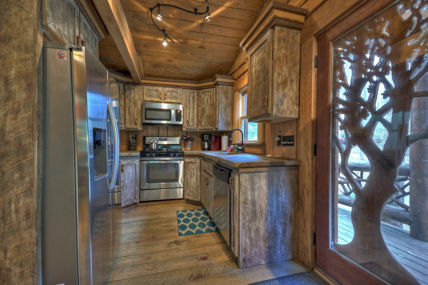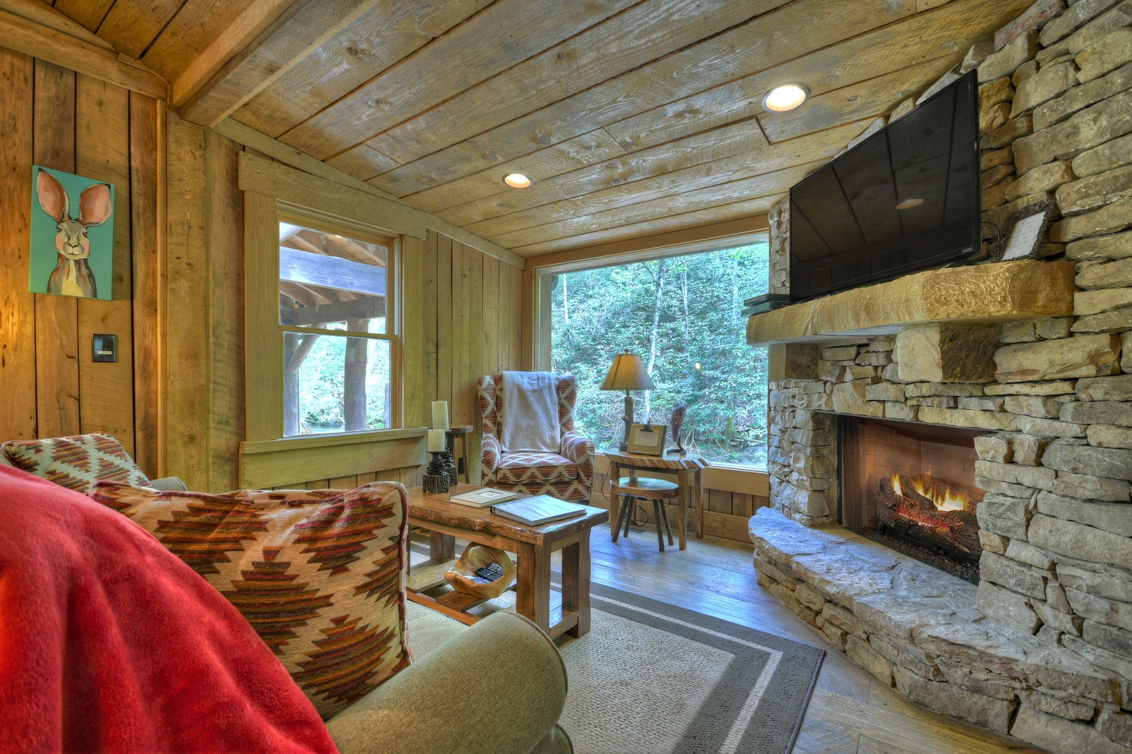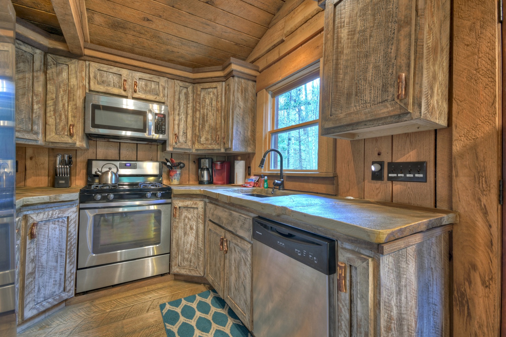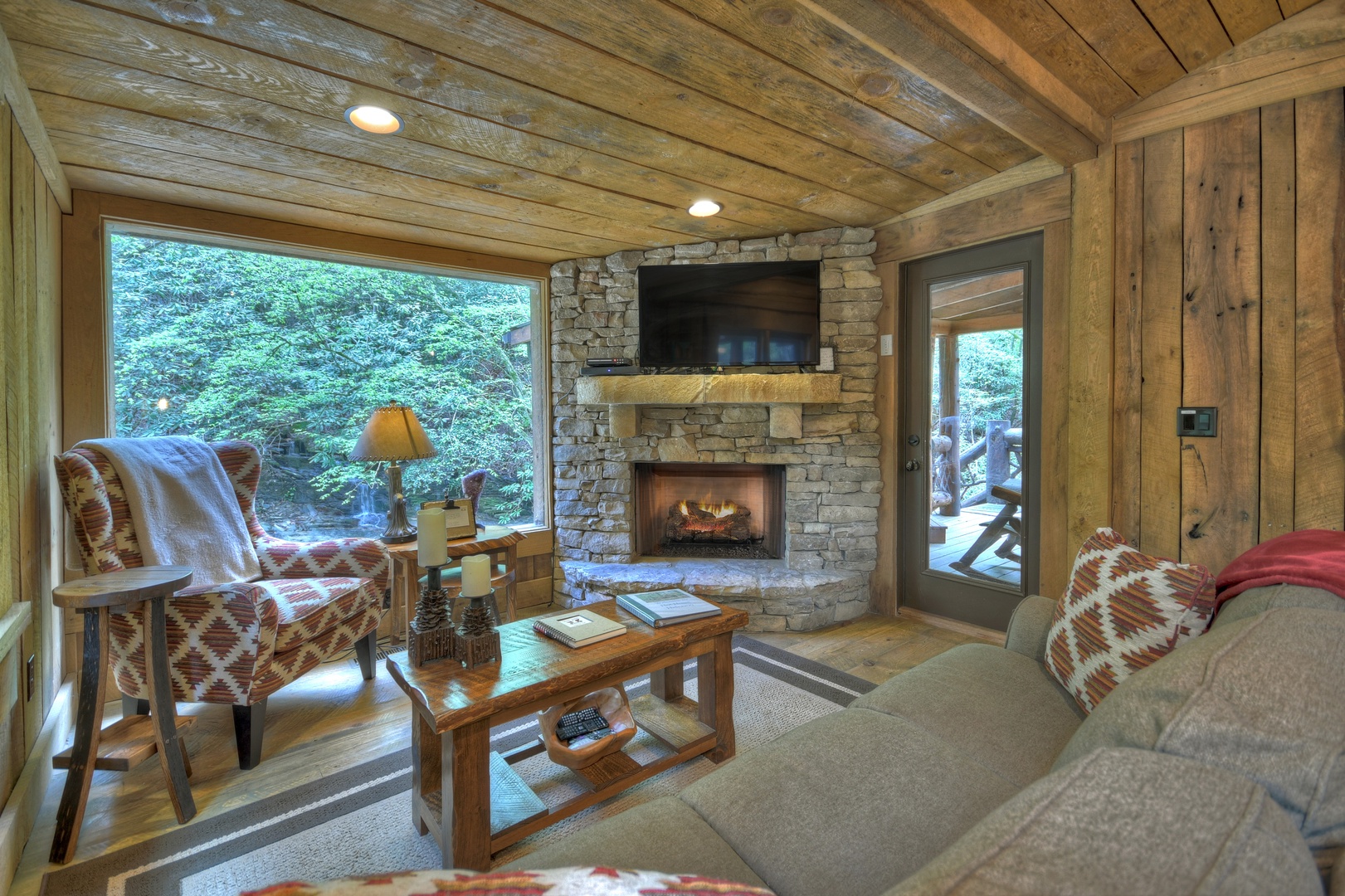 Inside Hothouse Hideaway you will discover a variety of handcrafted touches from the stone countertops to the hand hewn wood beams, stacked stone and barn wood trims. It's exactly what you would imagine in a rustic mountain home, but all new. The fully equipped kitchen is ready for you to prepare that mountainside meal with something hot off the gourmet KitchenAid grill located right outside the front door, or brew a cup of coffee with the Keurig as you make breakfast. Just off the kitchen is a quaint dining area and cozy living space to curl up by the fire or gaze at the spring fed falls out of the large picture frame window. This is the ultimate place for relaxation.