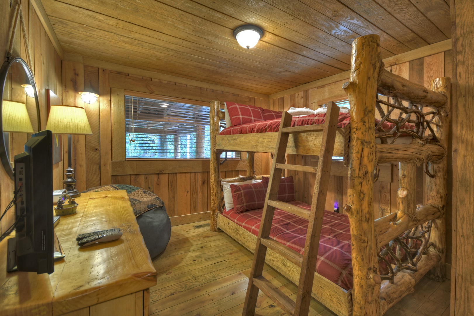 - Bedroom 1 offers two full beds on log bunk frame with Flat Panel TV and DVD player