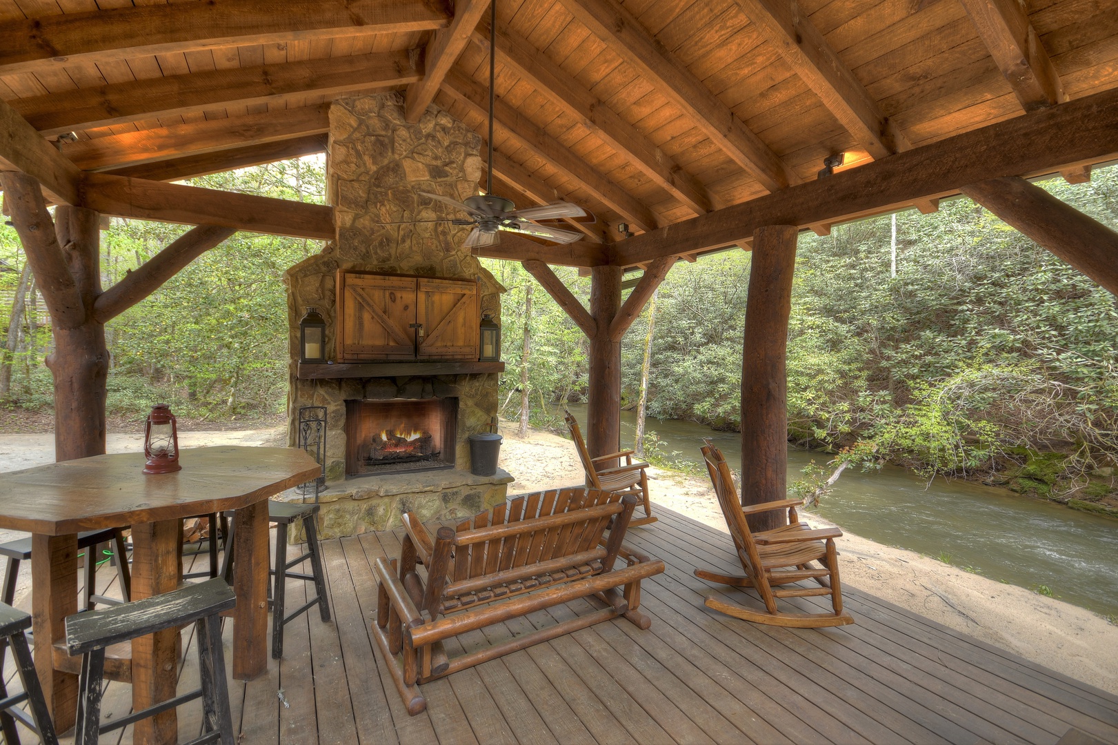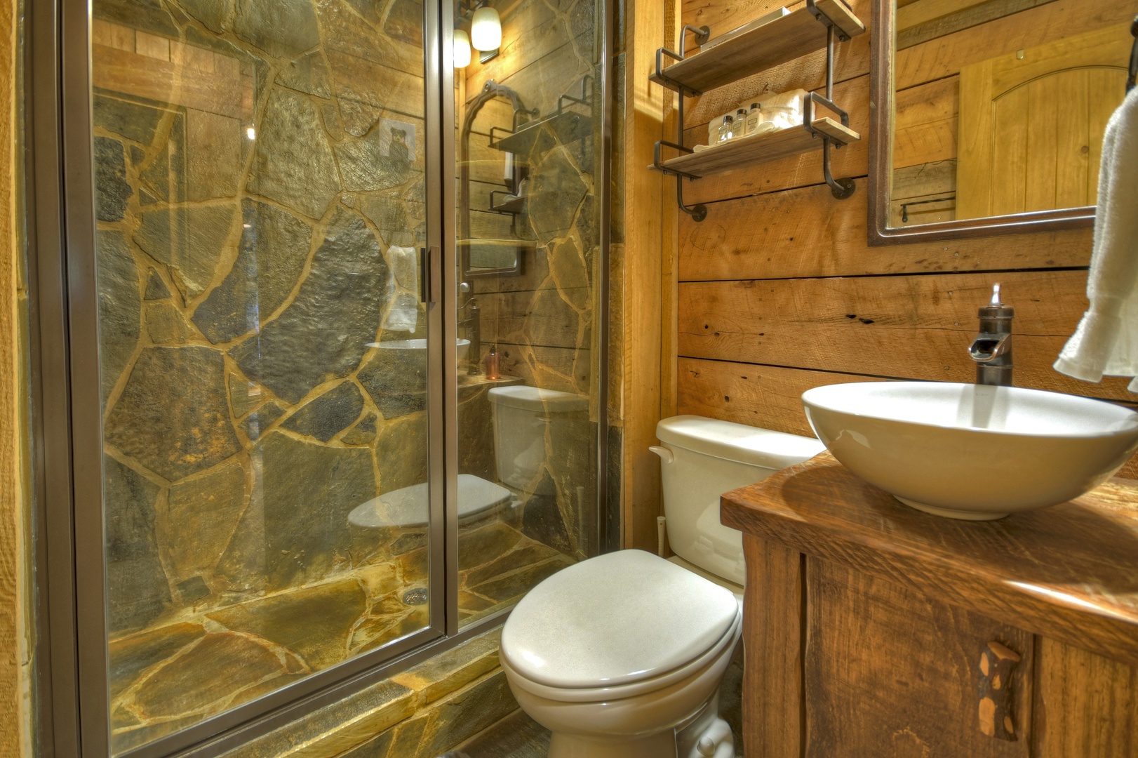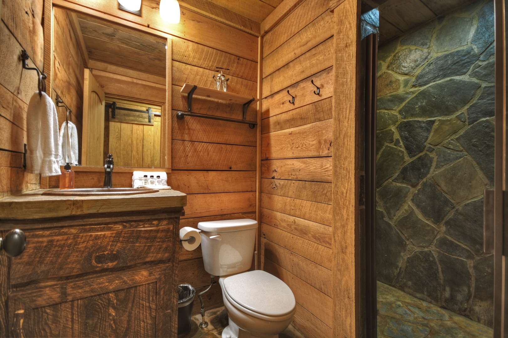 Both bedrooms face the creek and have their own bathrooms with amazing stone showers. Bedroom one is set up with two full beds in a real log bunk frame, so you can let a couple "camp out" together or give two or three kids plenty of sleeping space. The main suite boasts a beautiful hand made barn wood bed frame that nestles a comfy King bed, vaulted ceiling, large windows and walk out access to covered porch steps from the hot tub.