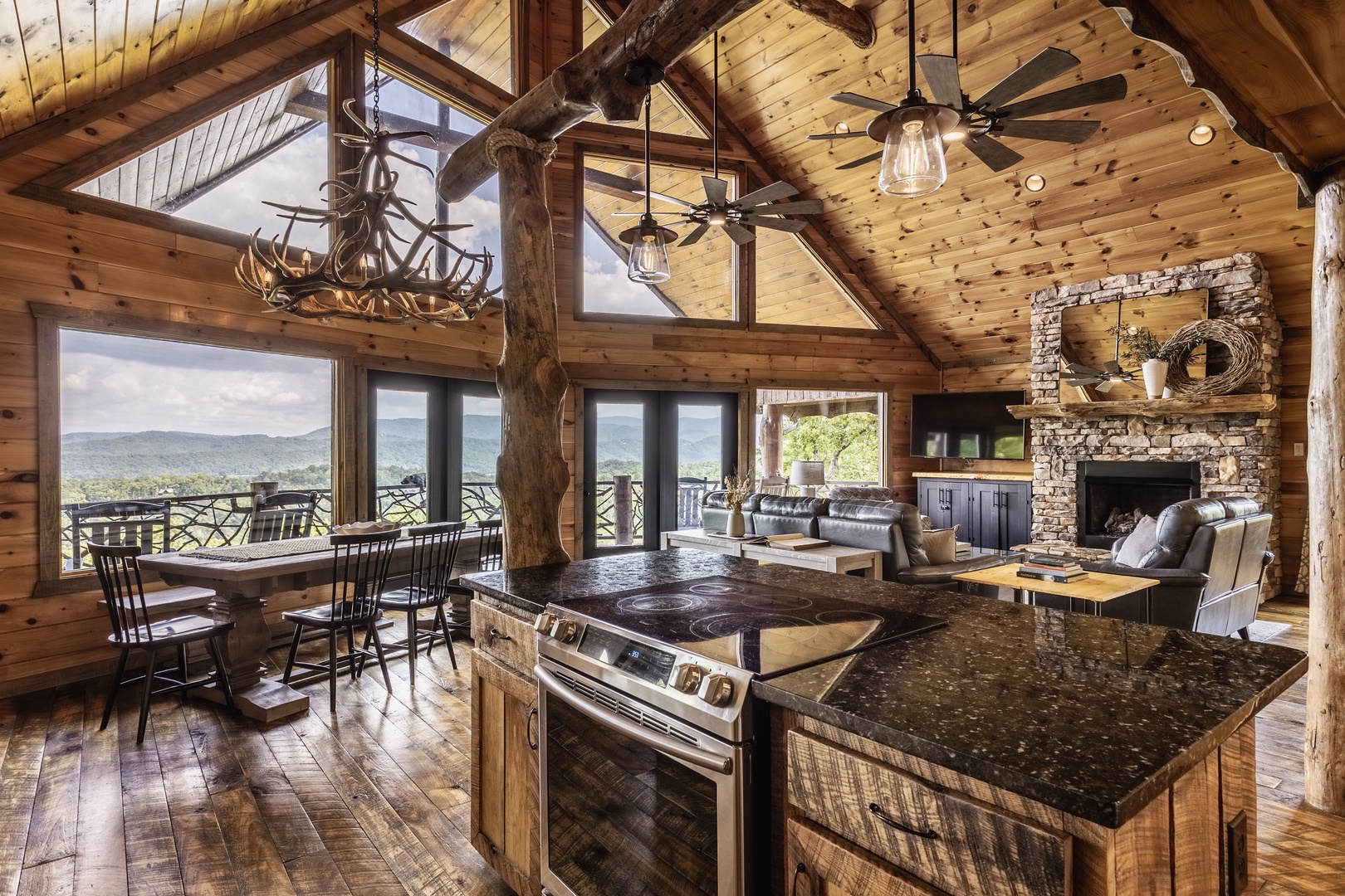 Luxurious, mountain views, a cozy gas fireplace, a relaxing hot tub, and expansive decks.