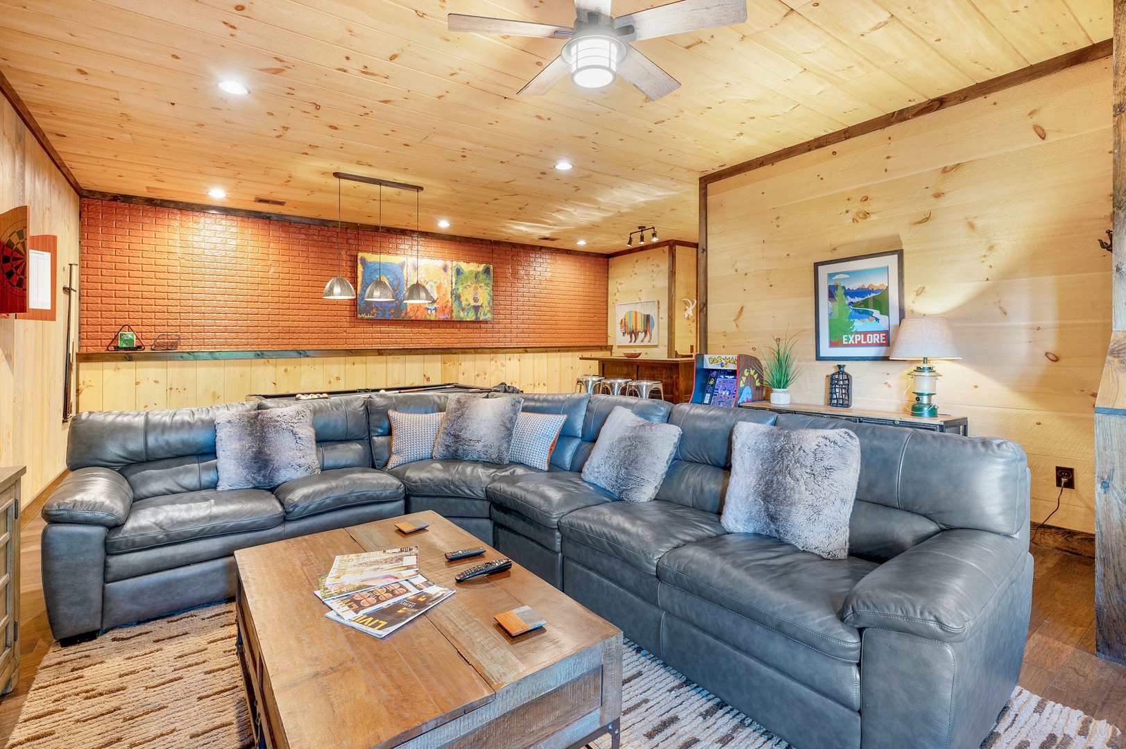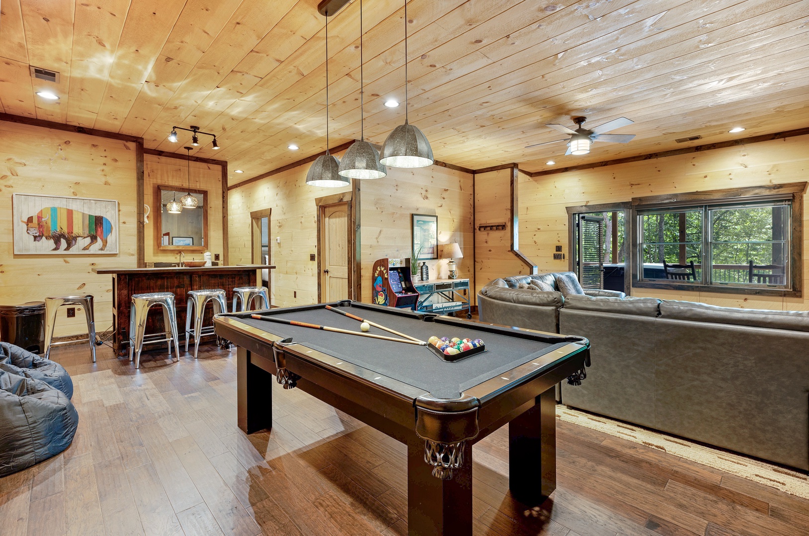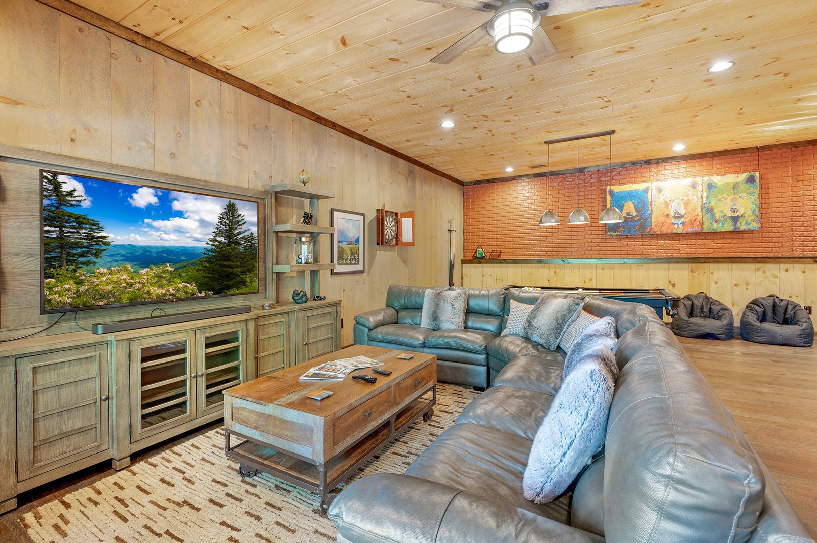 Mountain Echoes- Lower level seating and gaming area with a pool table