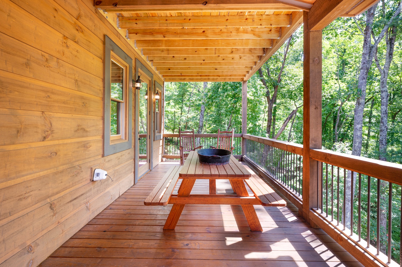 Mountain Echoes- Entry level outdoor dining area and rocking chairs