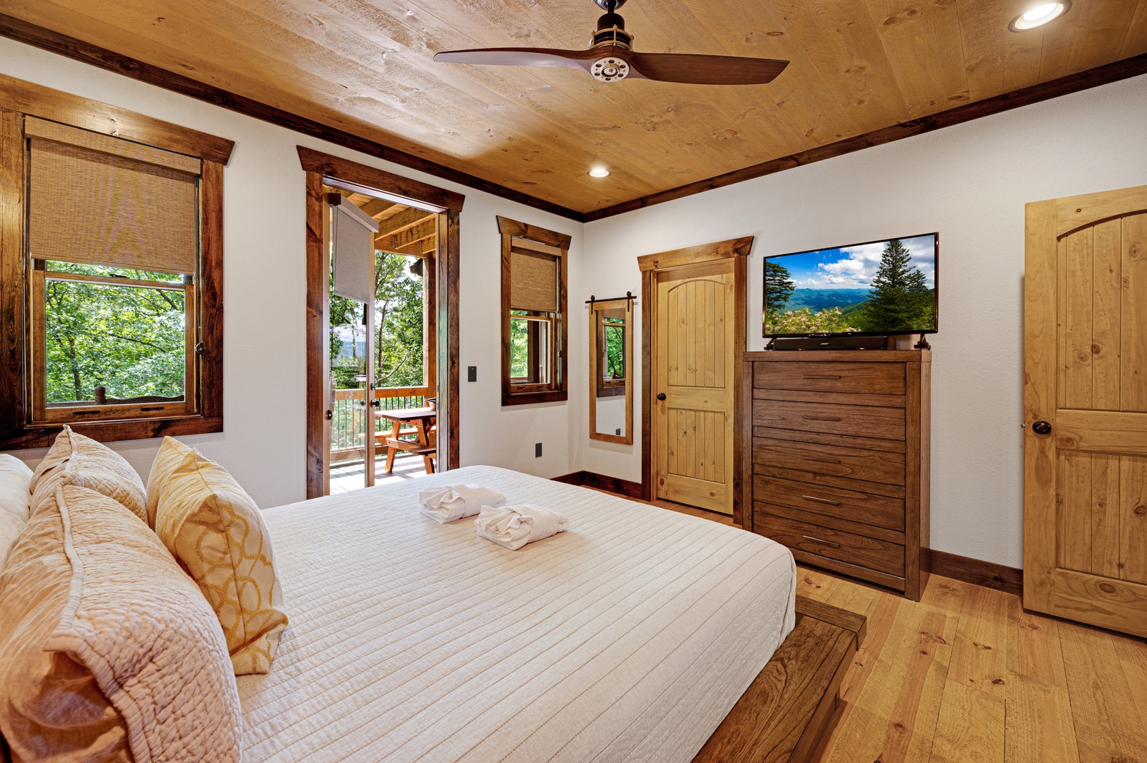 Mountain Echoes- Bedroom with deck access a dresser and TV