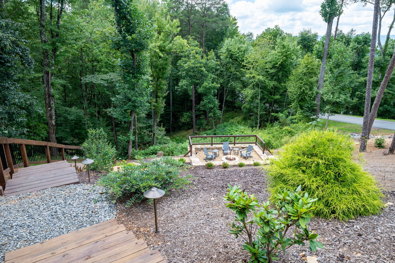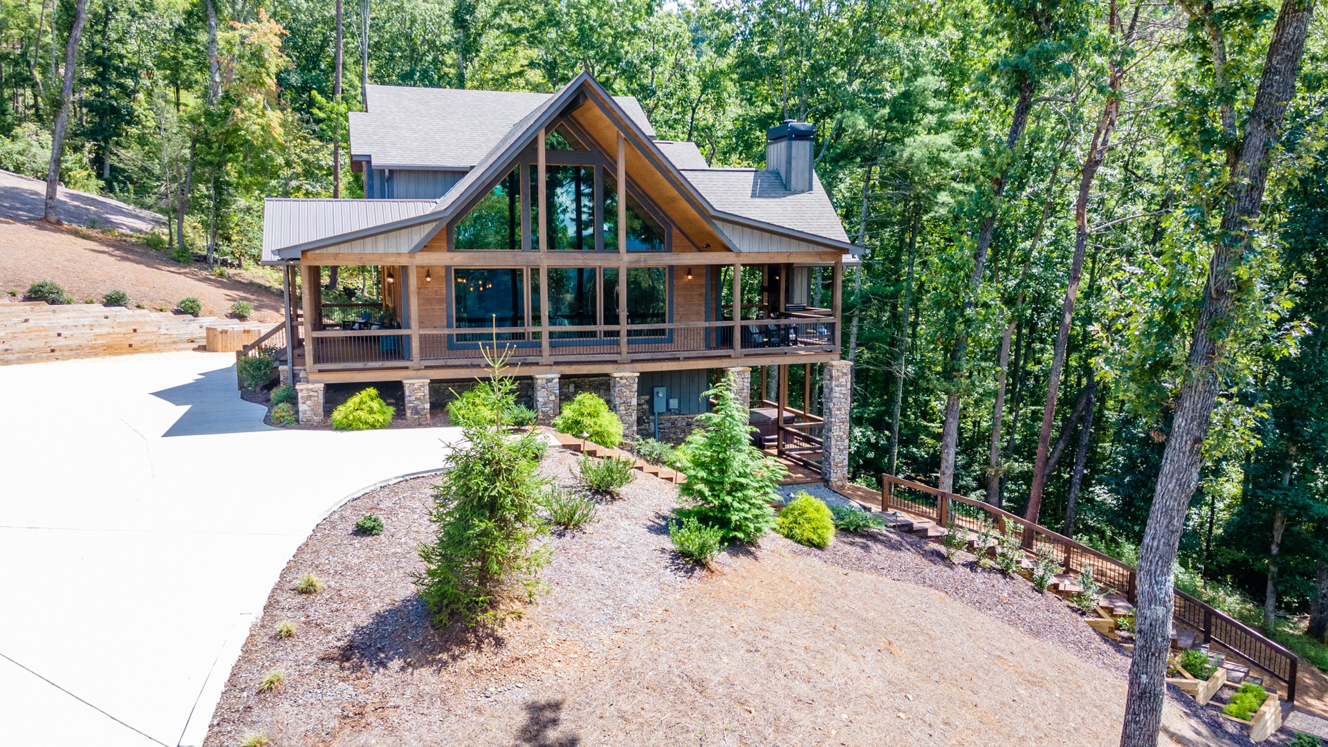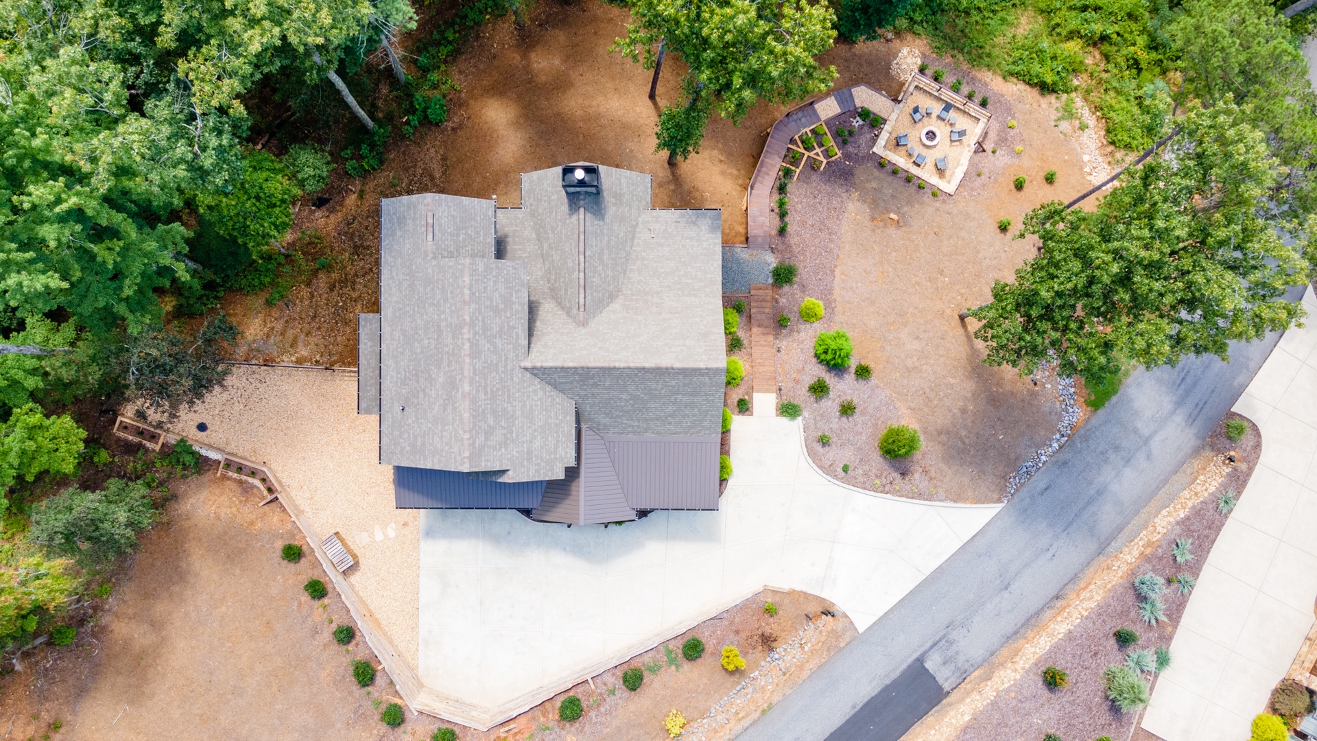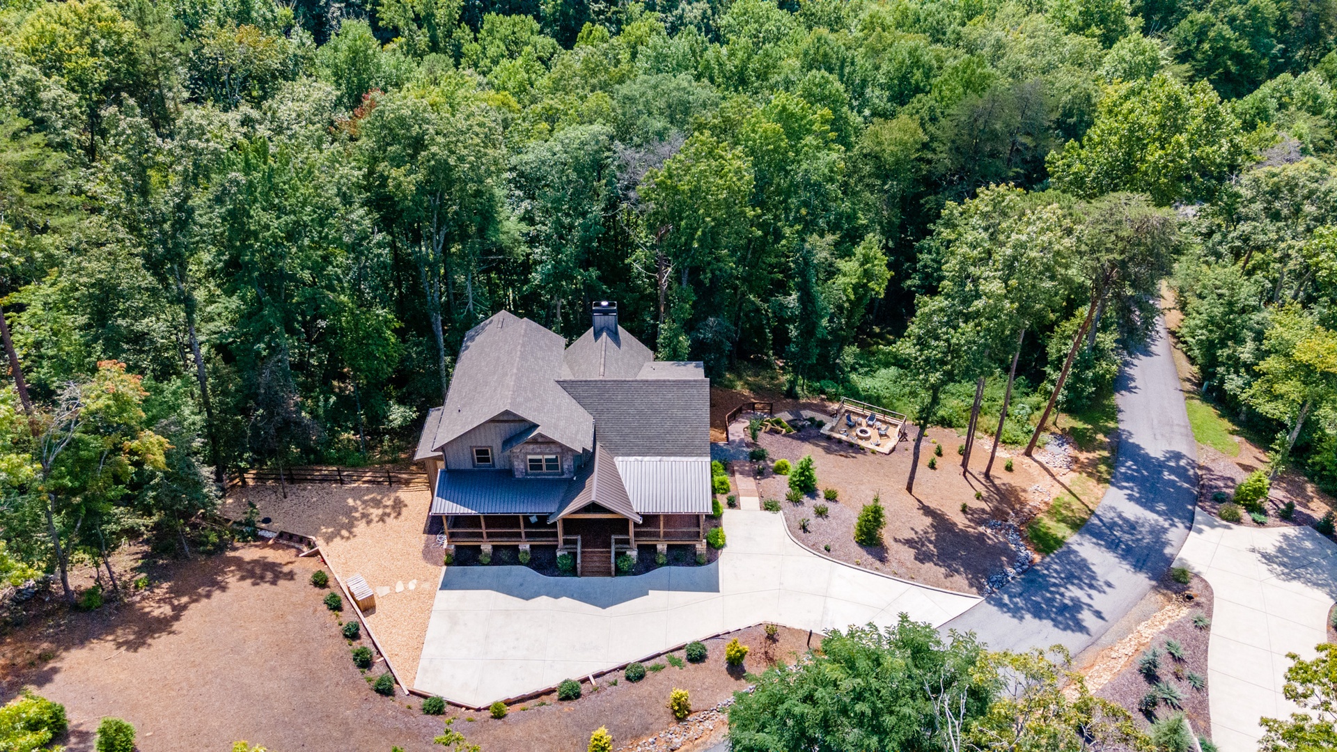 Mountain Echoes- Aerial view of the cabin leading down to the fireplace