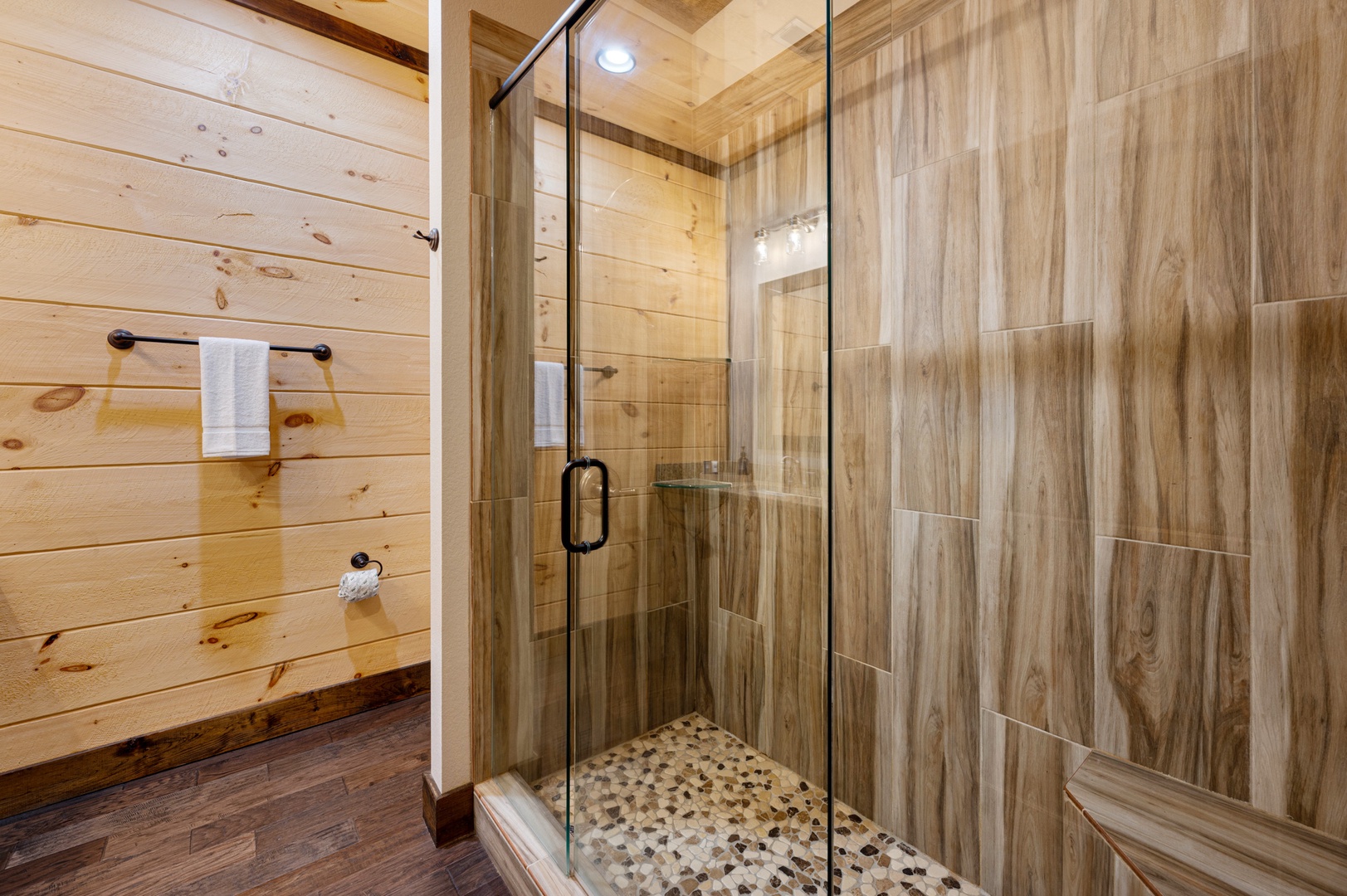 Mountain Echoes- Lower level shared bath with a walk in shower