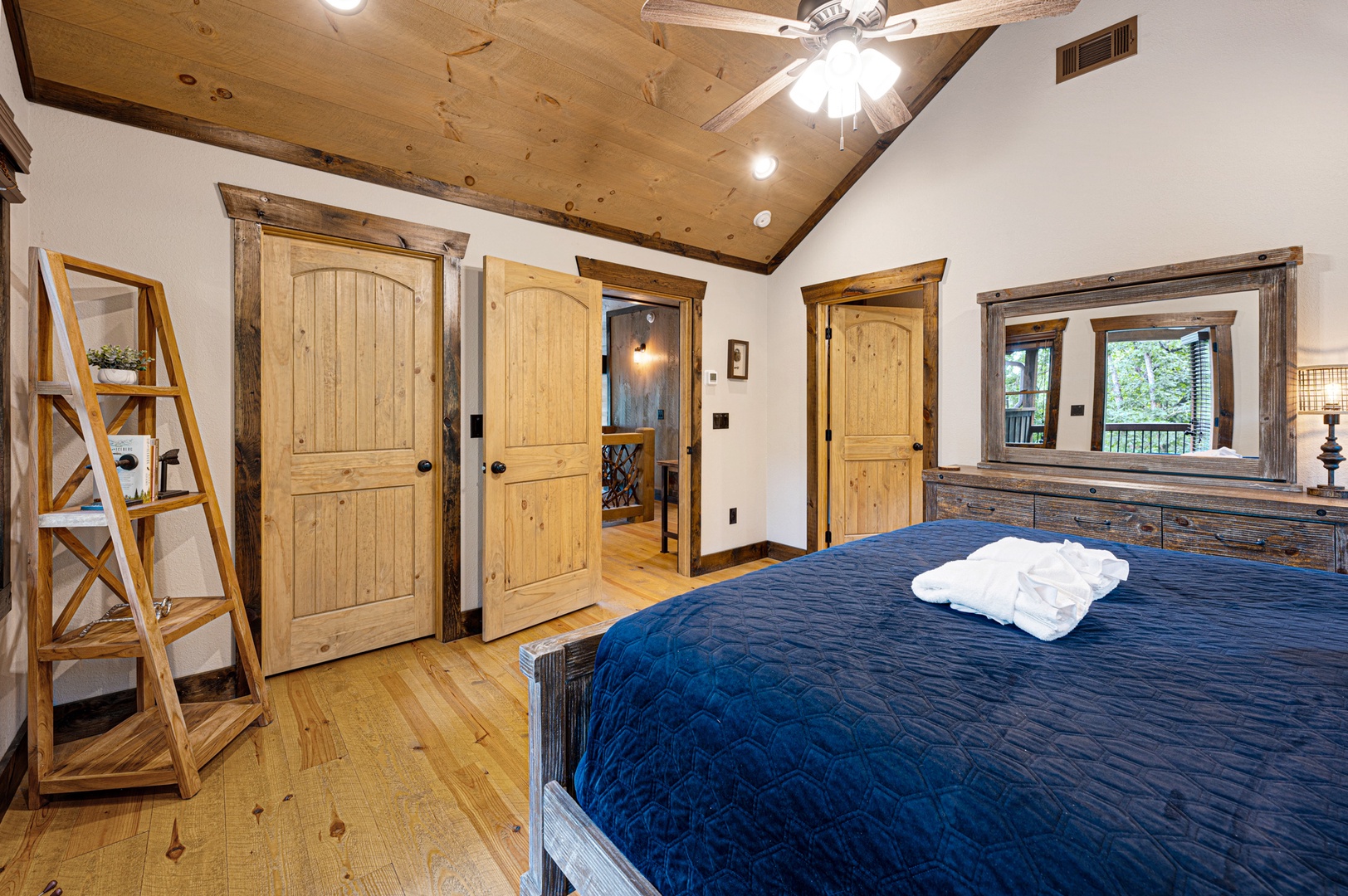 Mountain Echoes- Upper level king bedroom with a dresser and mirror