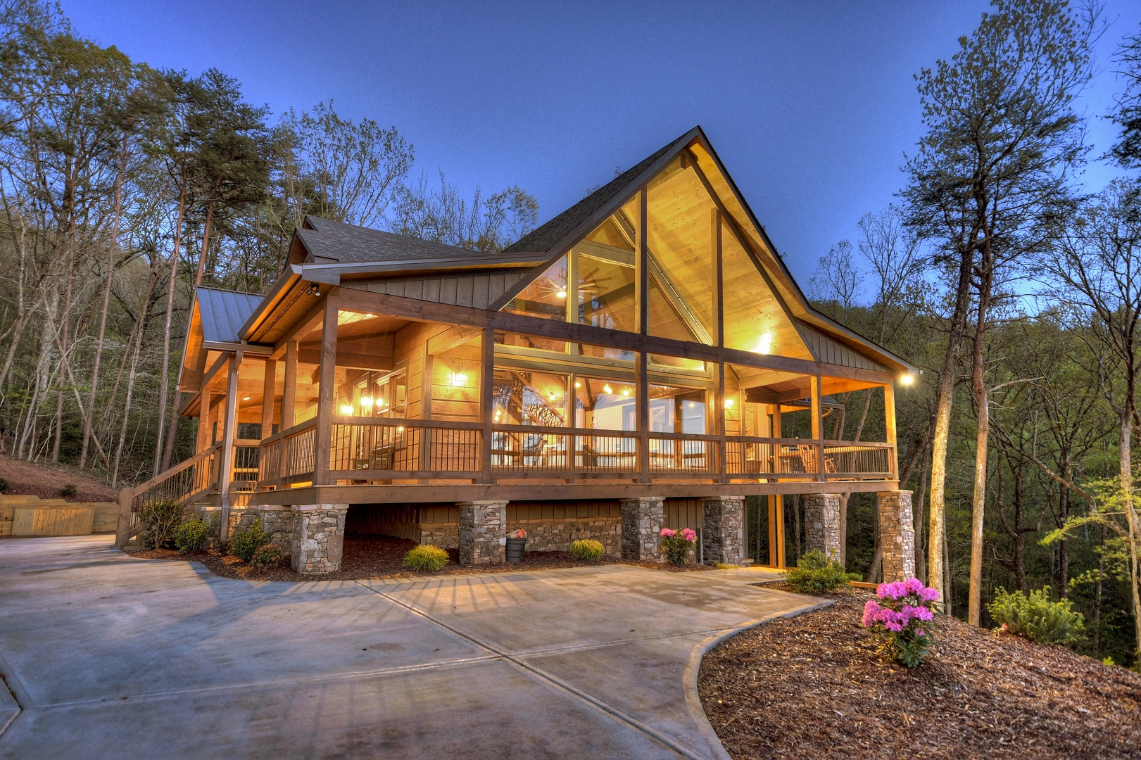 Mountain Echoes- Exterior view of the cabin at dusk from the driveway