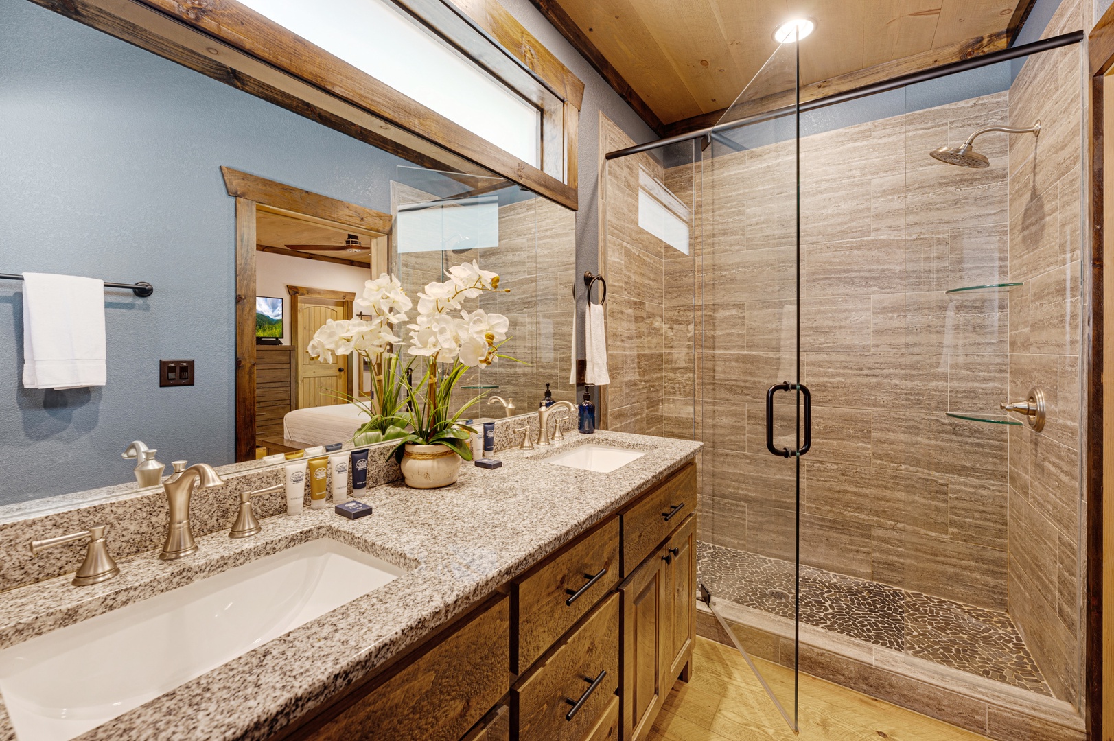 Mountain Echoes- Entry level private bathroom with double vanity sink, and walk in shower