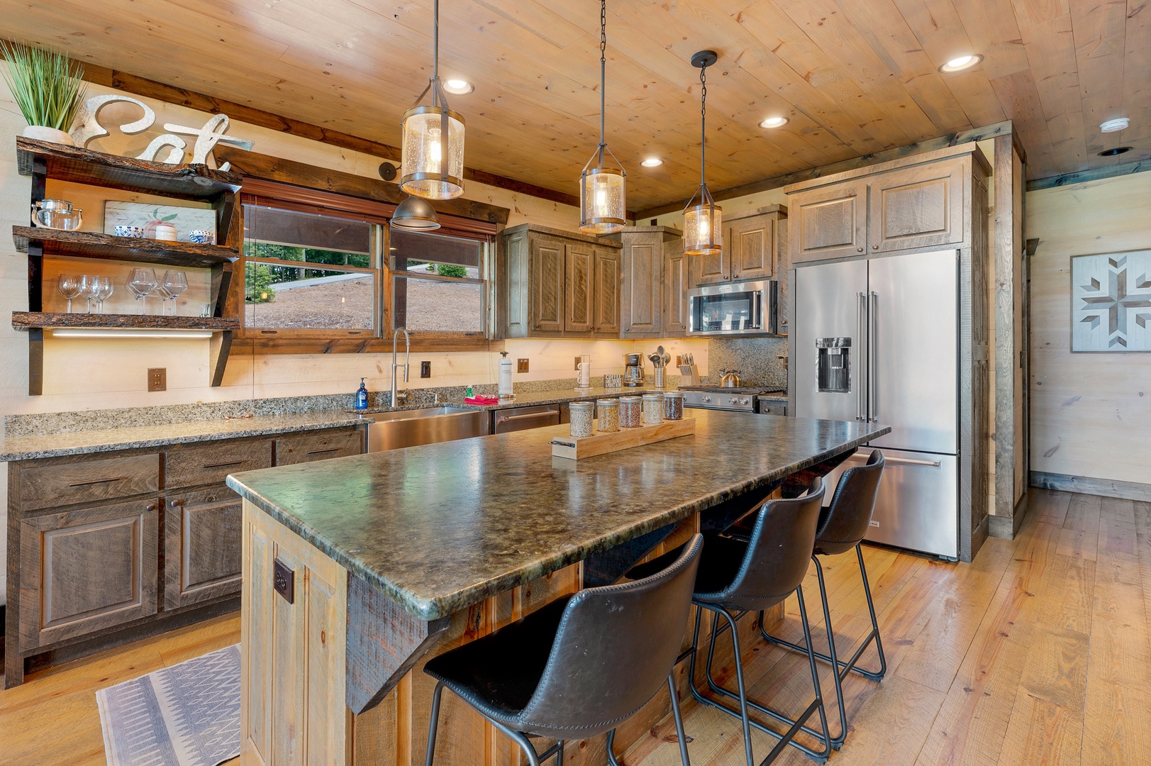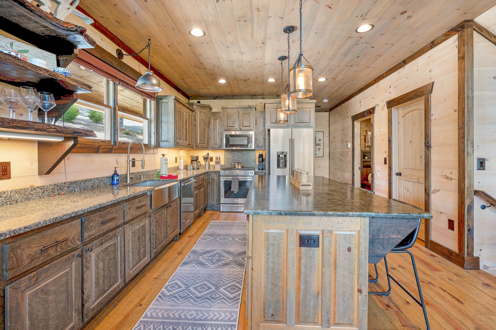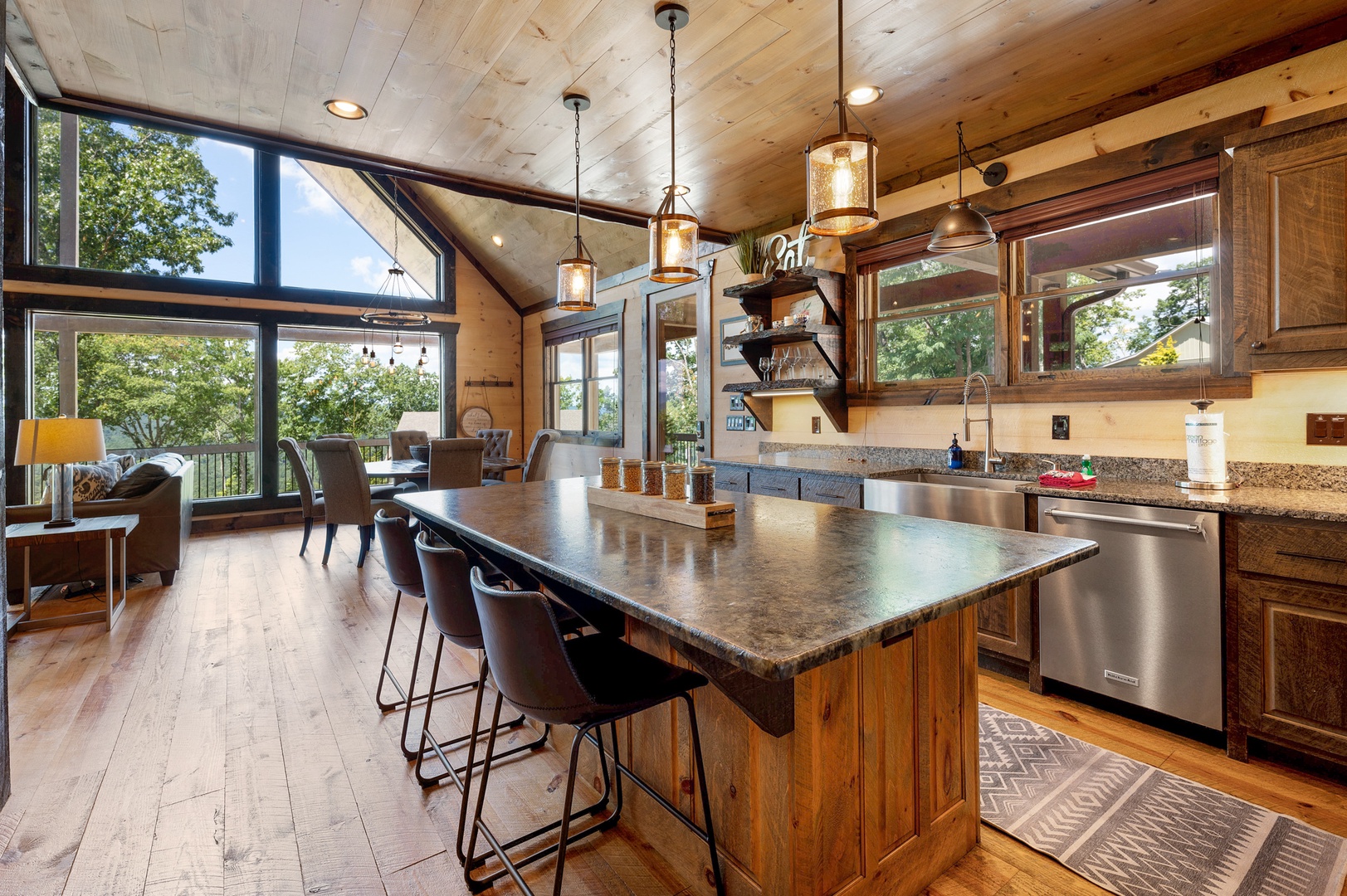 Mountain Echoes- Kitchen area with an island and stools