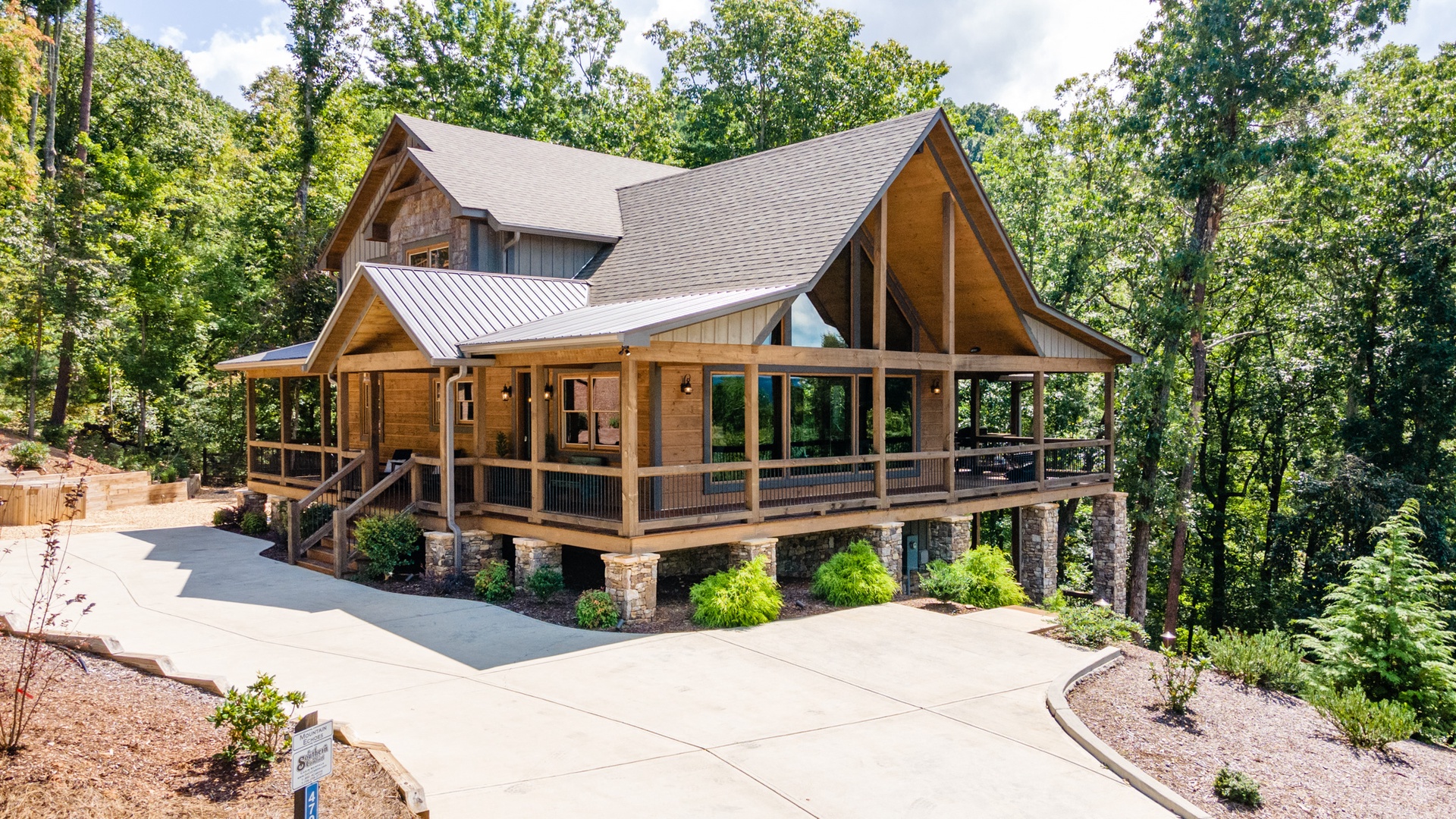Mountain Echoes- Exterior view of the cabin and driveway area