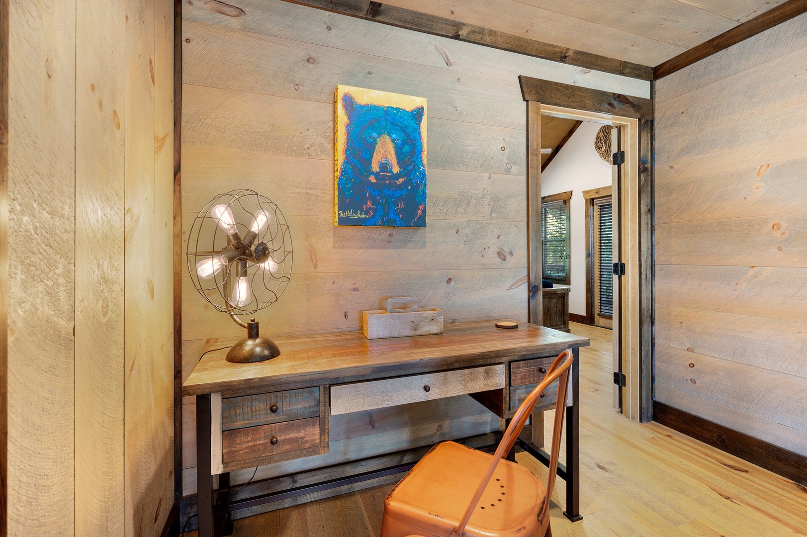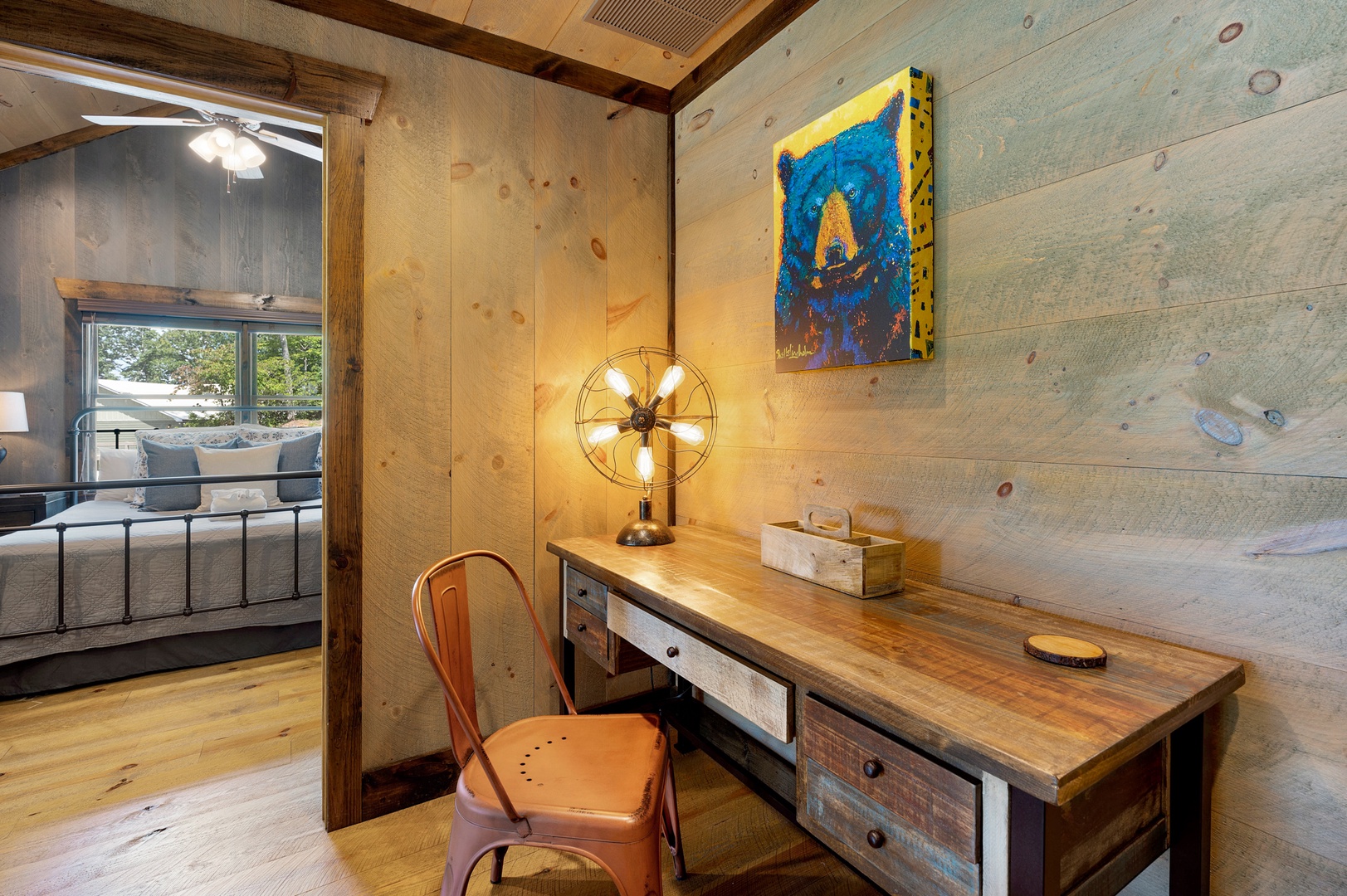 Mountain Echoes- Office area with a chair and bedroom access