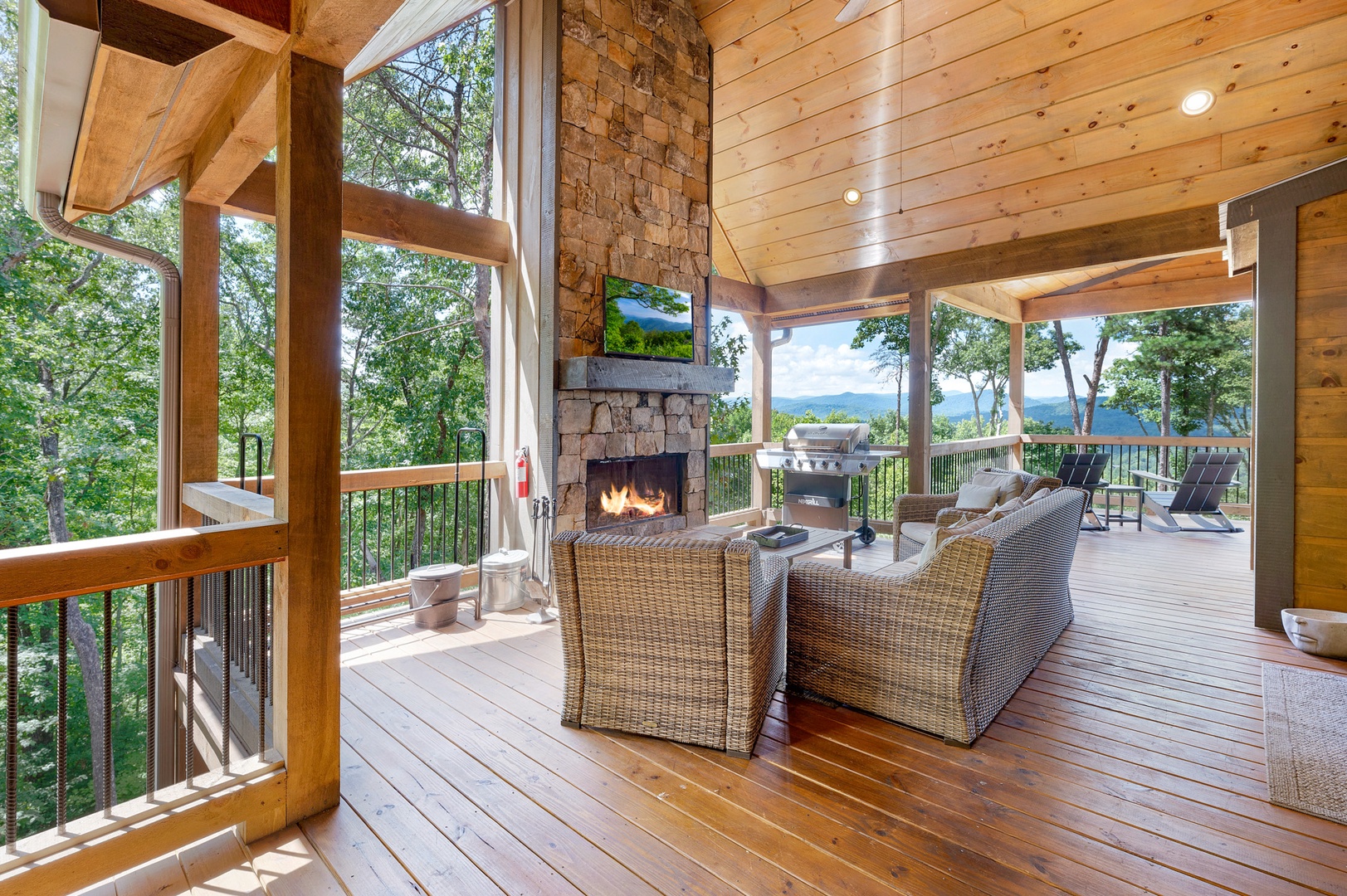 Mountain Echoes- Outdoor fireplace with deck seating and TV