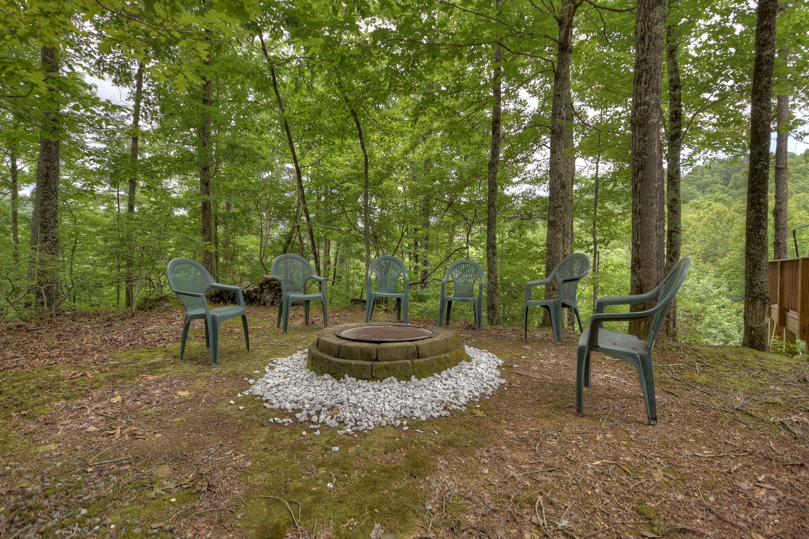- To the side of the cabin, you will find the fire pit with ample seating for the whole family