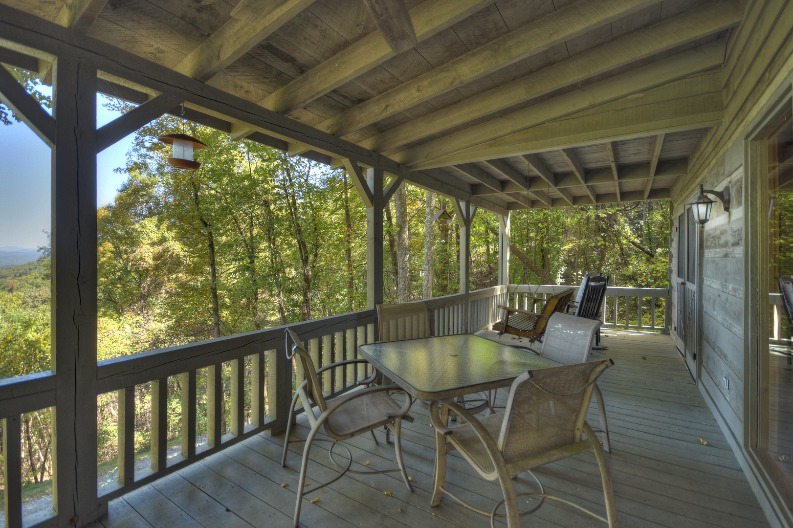 Ridgetop Pointaview- Entry level deck area with outdoor dining and a bench swing