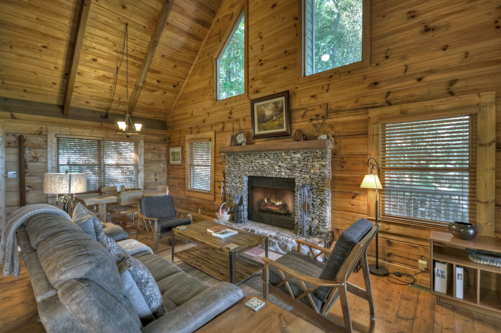 Ridgetop Pointaview- Entry level living room area with a stone fireplace and deck access