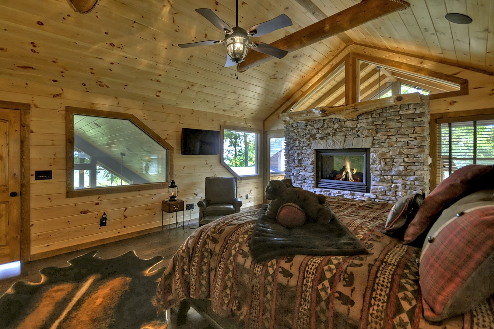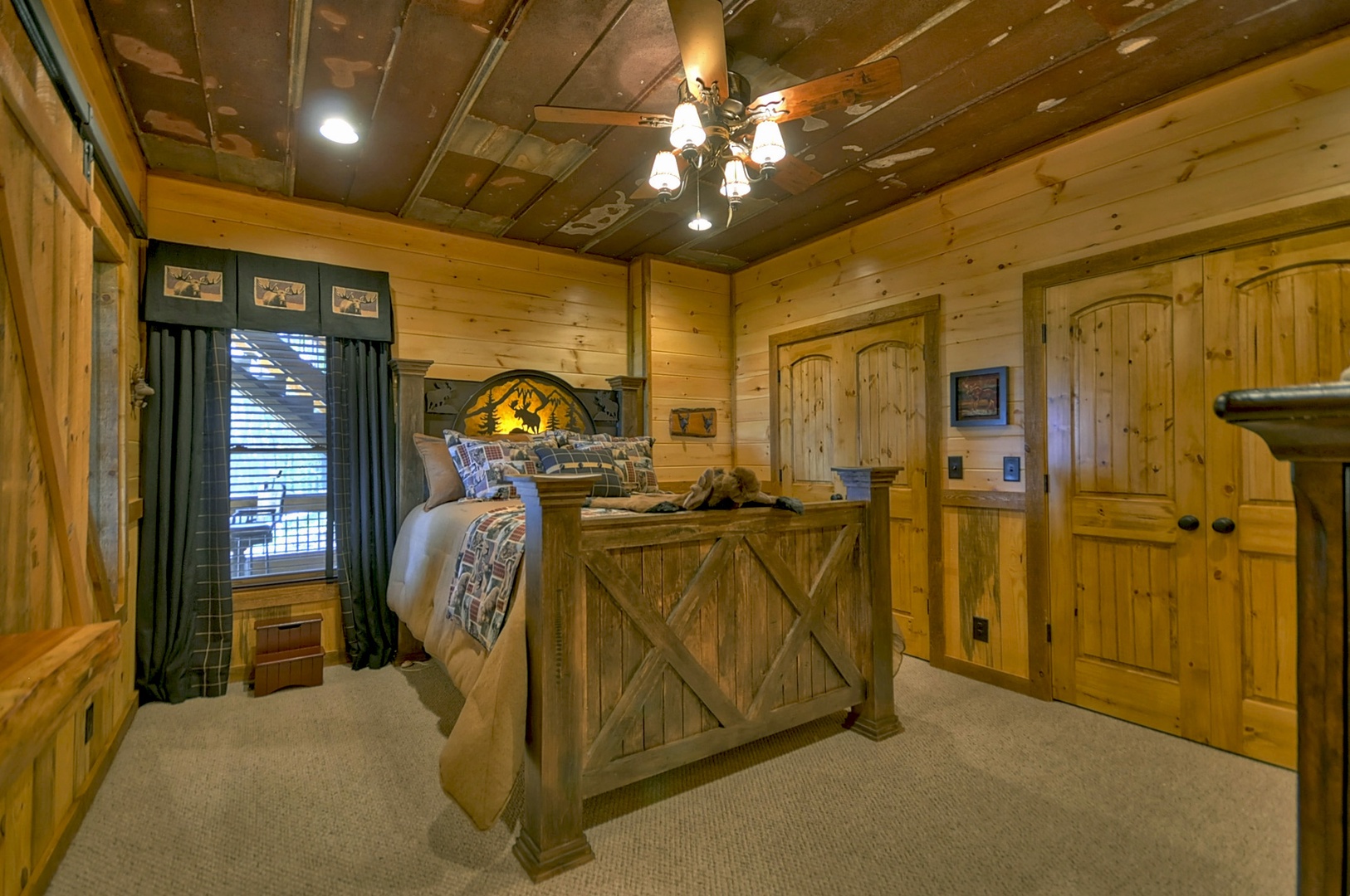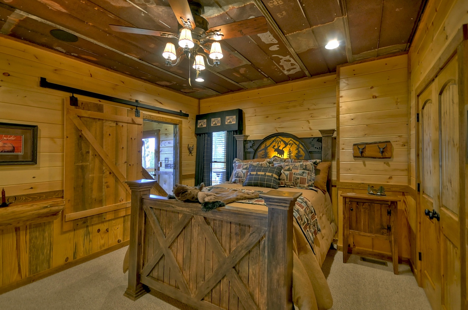 The Vue Over Blue Ridge- Bedroom with sliding window and rustic decor