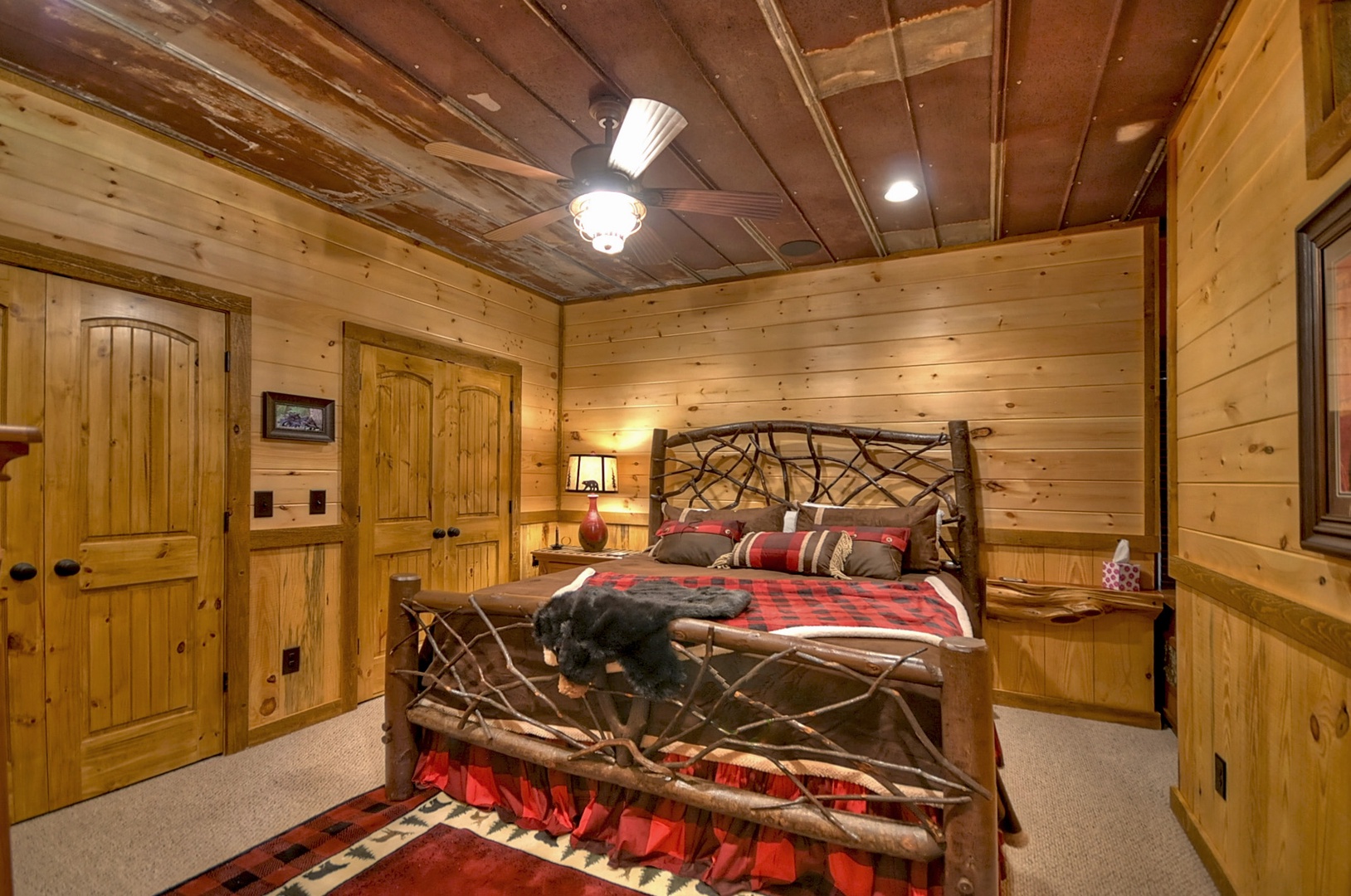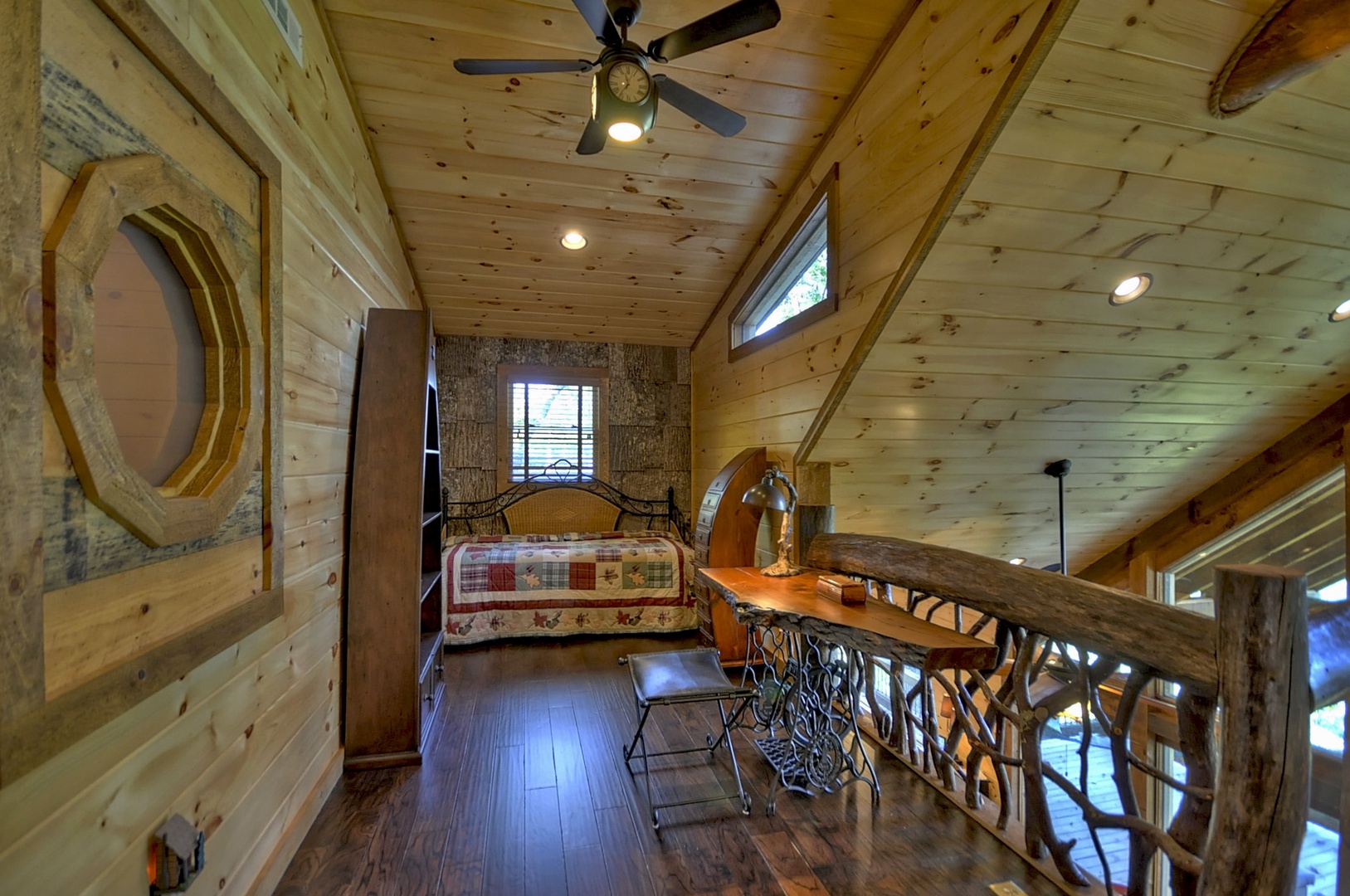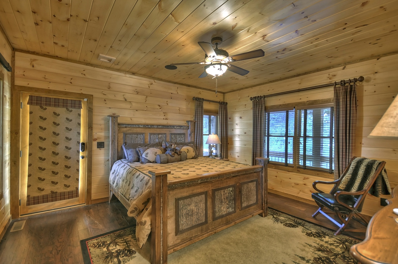 The Vue Over Blue Ridge- Bedroom with sliding window and rustic decor